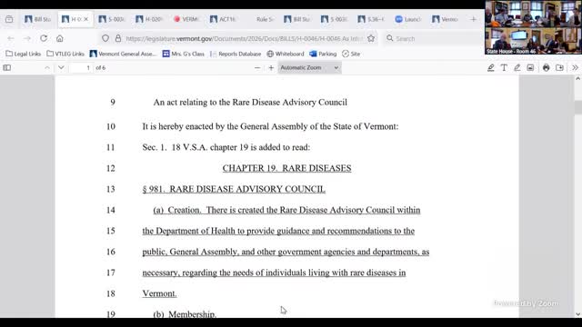 Committee reviews H.46 creating a Rare Disease Advisory Council; outlines membership and duties