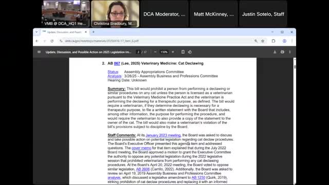 Veterinary Medical Board votes to oppose AB 867, citing reporting burden and regulation of medical practice