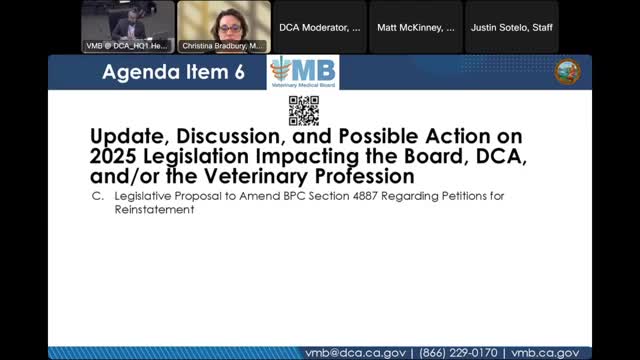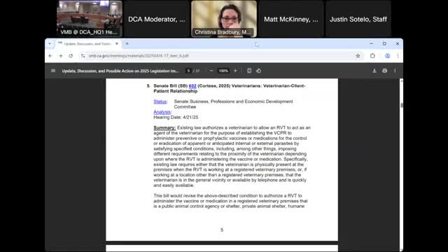 Veterinary Medical Board opposes AB 1458 on animal physical therapy, citing enforcement and scope concerns