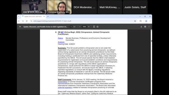 Board opposes SB 687 allowing uncertified chiropractors to perform animal chiropractic without veterinary supervision