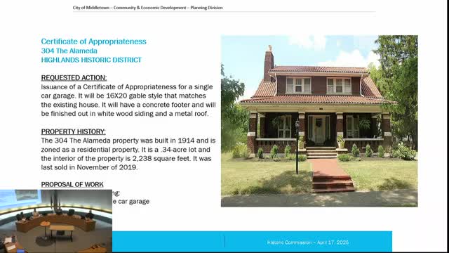 Middletown historic commission tables garage certificate for 304 Alameda, cites insufficient documentation