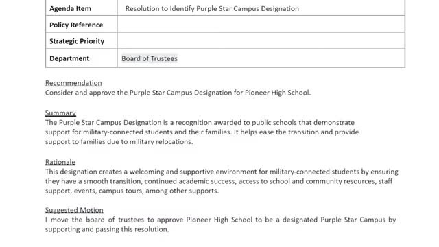 Sharyland ISD board approves Purple Star campus designation to support military‑connected students