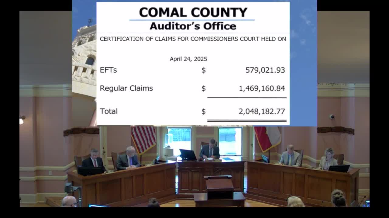 Comal County commissioners approve claims, plats, leases, precinct changes and settlement; multiple routine items cleared