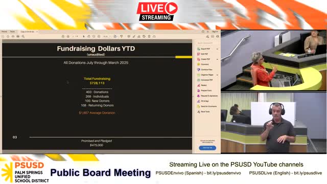 Palm Springs Unified Foundation reports $728,113 cash on hand, $475,000 pledged; seeks Measure J funds for Richards Center audio upgrade