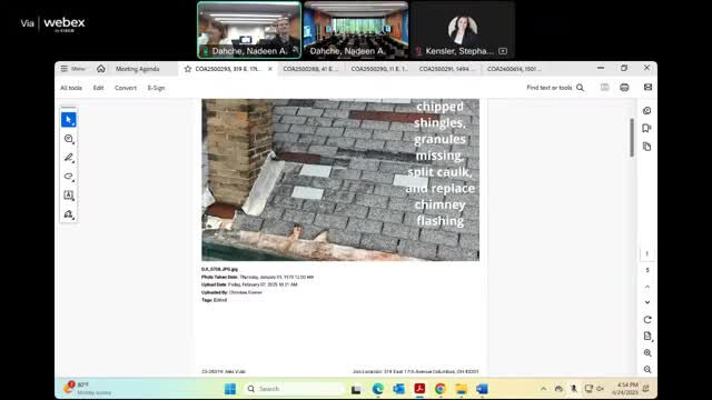 Board continues review of roof and gutter work on potentially contributing building, asks for details and repair options