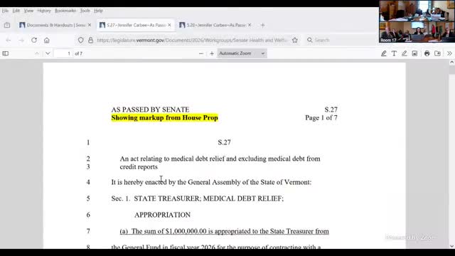 Senate committee reviews S.27 to fund medical-debt abolition, bar medical debt from credit reports and add behavioral-health definition