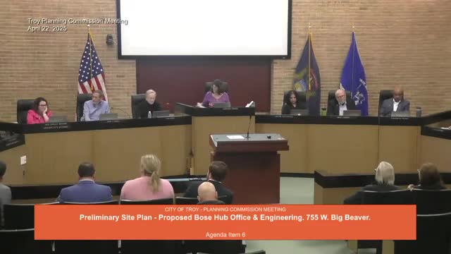 Planning commission approves preliminary site plan for 78,000‑square‑foot Bose Hub at Troy Center