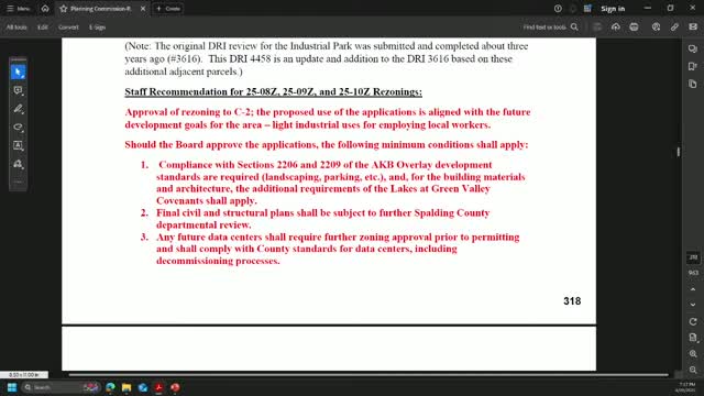 Planning commission recommends approval of two data‑center rezones and special exceptions despite strong public concern about water, power and long‑term impacts