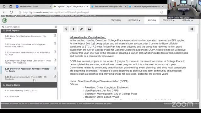 College Place updates: Lions Park dedication, sister‑city committee, chamber charrette and downtown association incorporation