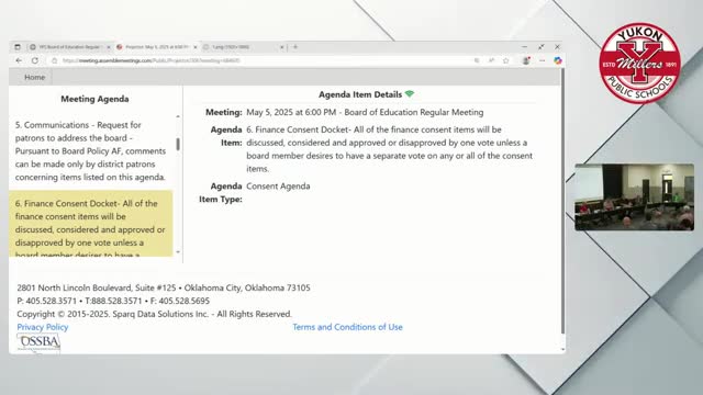 Yukon school board approves finance and business consent dockets, elects representative to state investment cooperative and approves personnel actions after an—