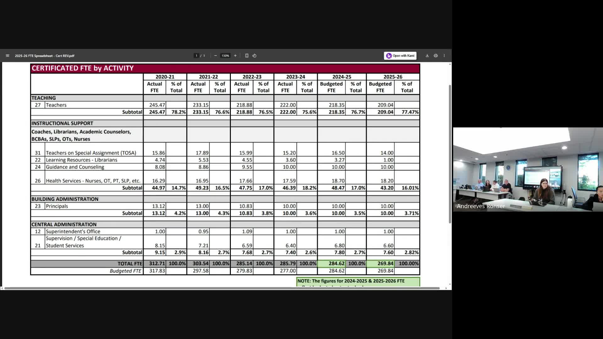 Board and staff review FTE and enrollment projections; fractional positions, bumping and kindergarten counts discussed
