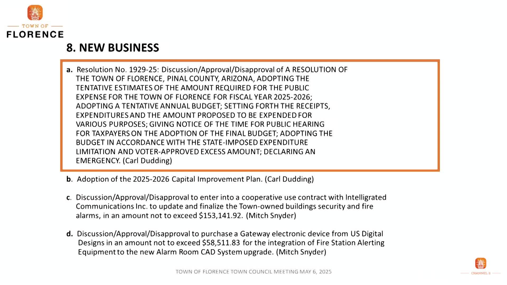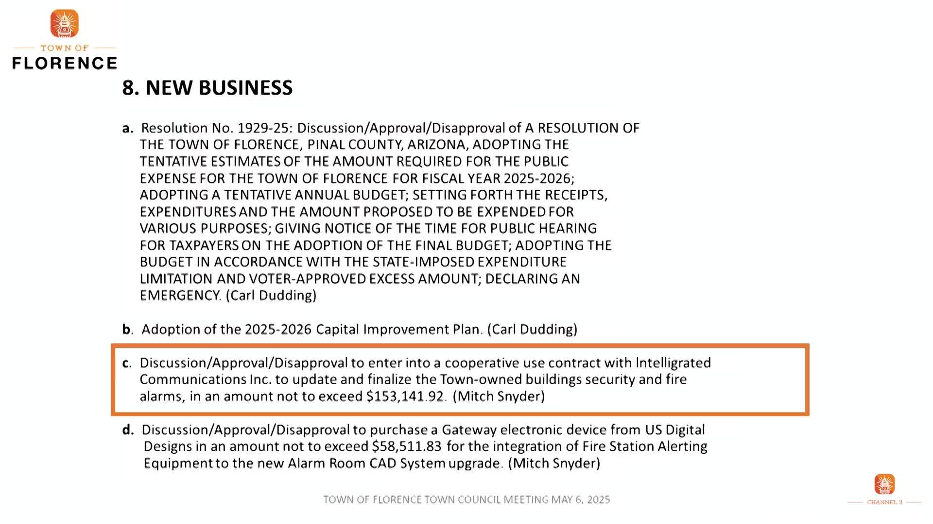 Florence council approves cooperative contract for security and fire-alarm upgrades and purchases gateway device for station alerting