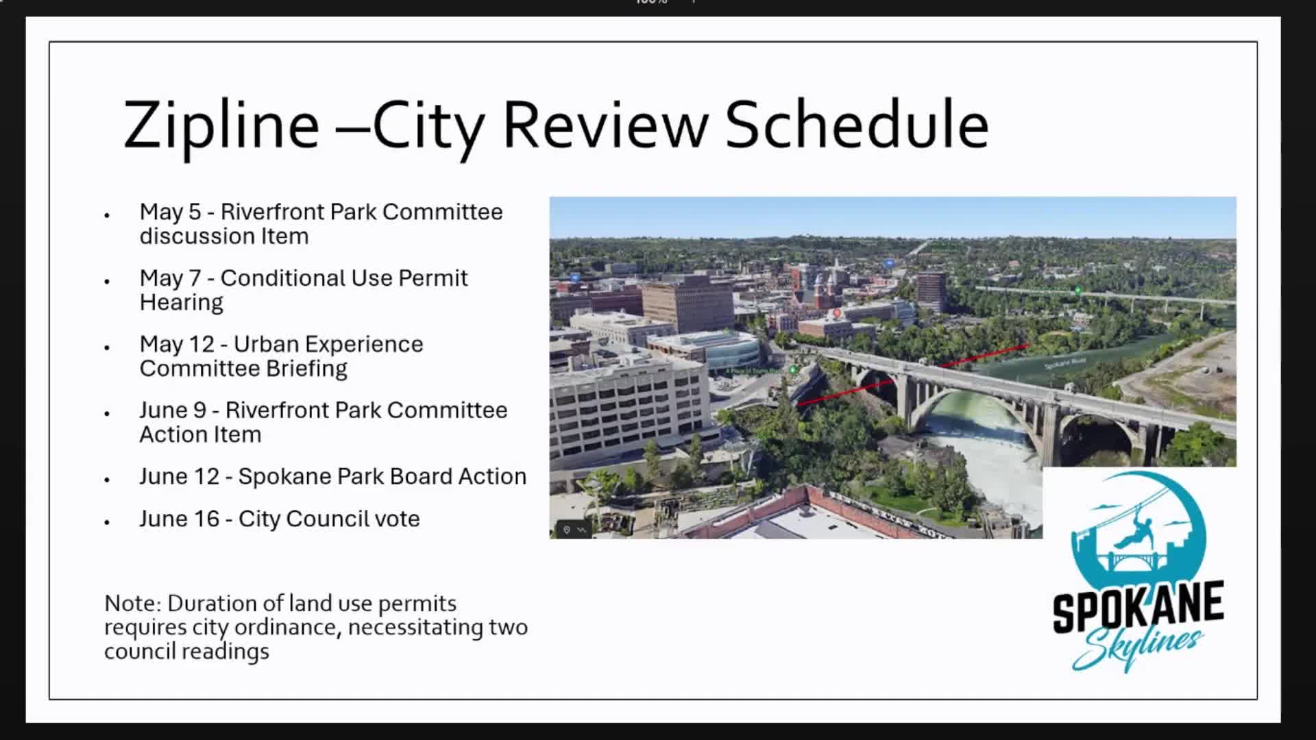Riverfront staff brief board on zipline permitting, conditional approvals and contract timeline