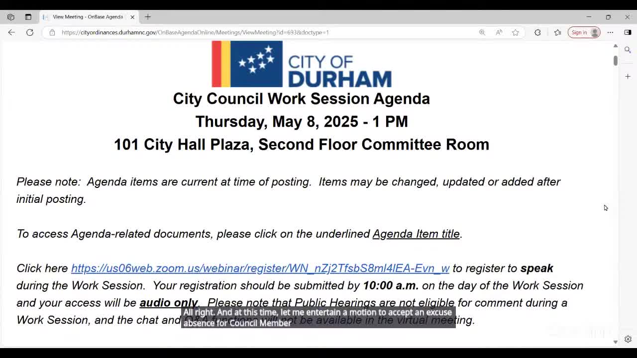 Council motions: excused absence granted, manager items received; closed session scheduled