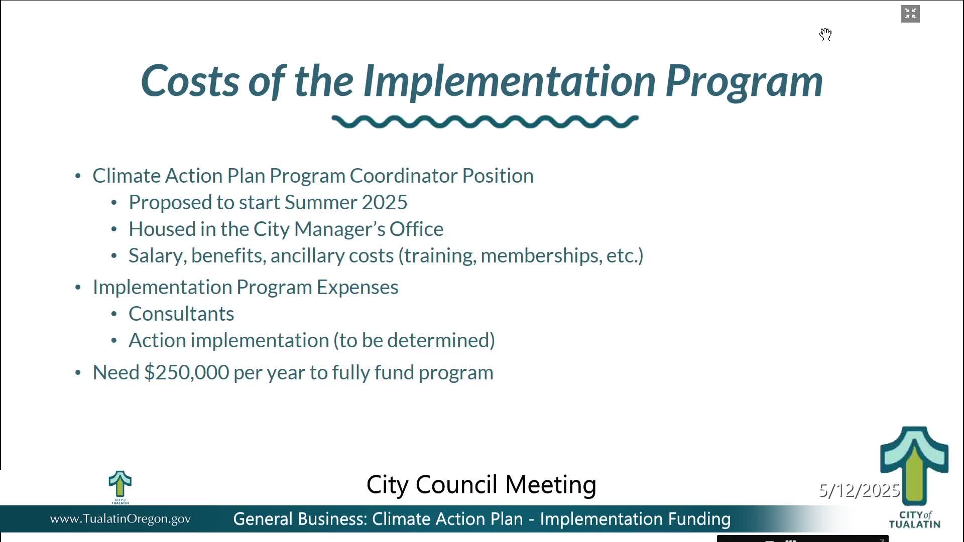 Tualatin council debates braided funding options for climate action plan; staff to return with household impact estimates