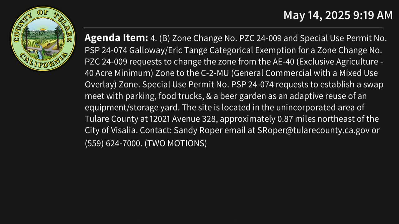 Planning Commission approves swap‑meet special use permit, recommends zone change for 12021 Avenue 328