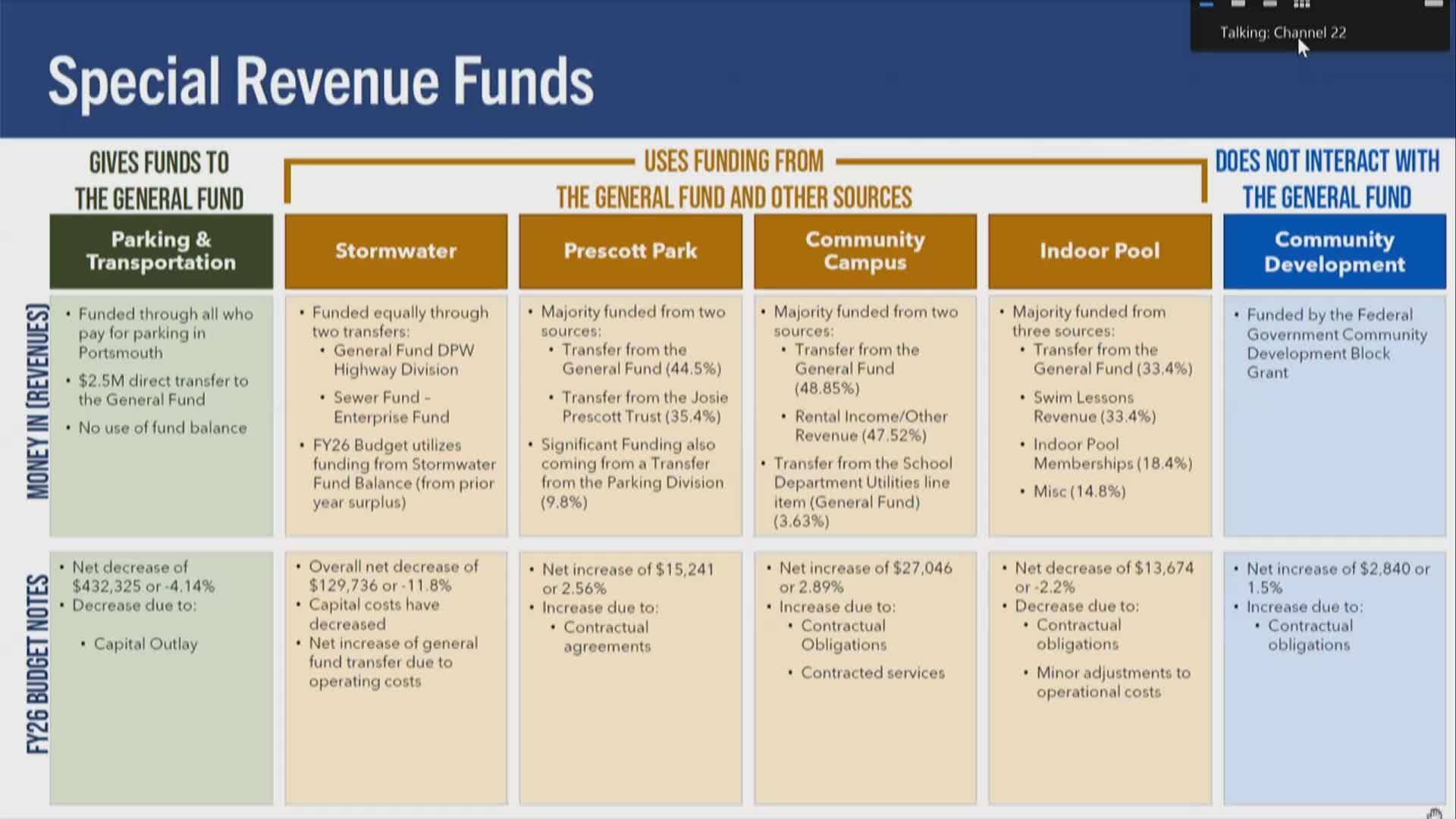 Council hears FY26 special‑revenue budget: parking revenue, stormwater options, Prescott Park and community campus updates