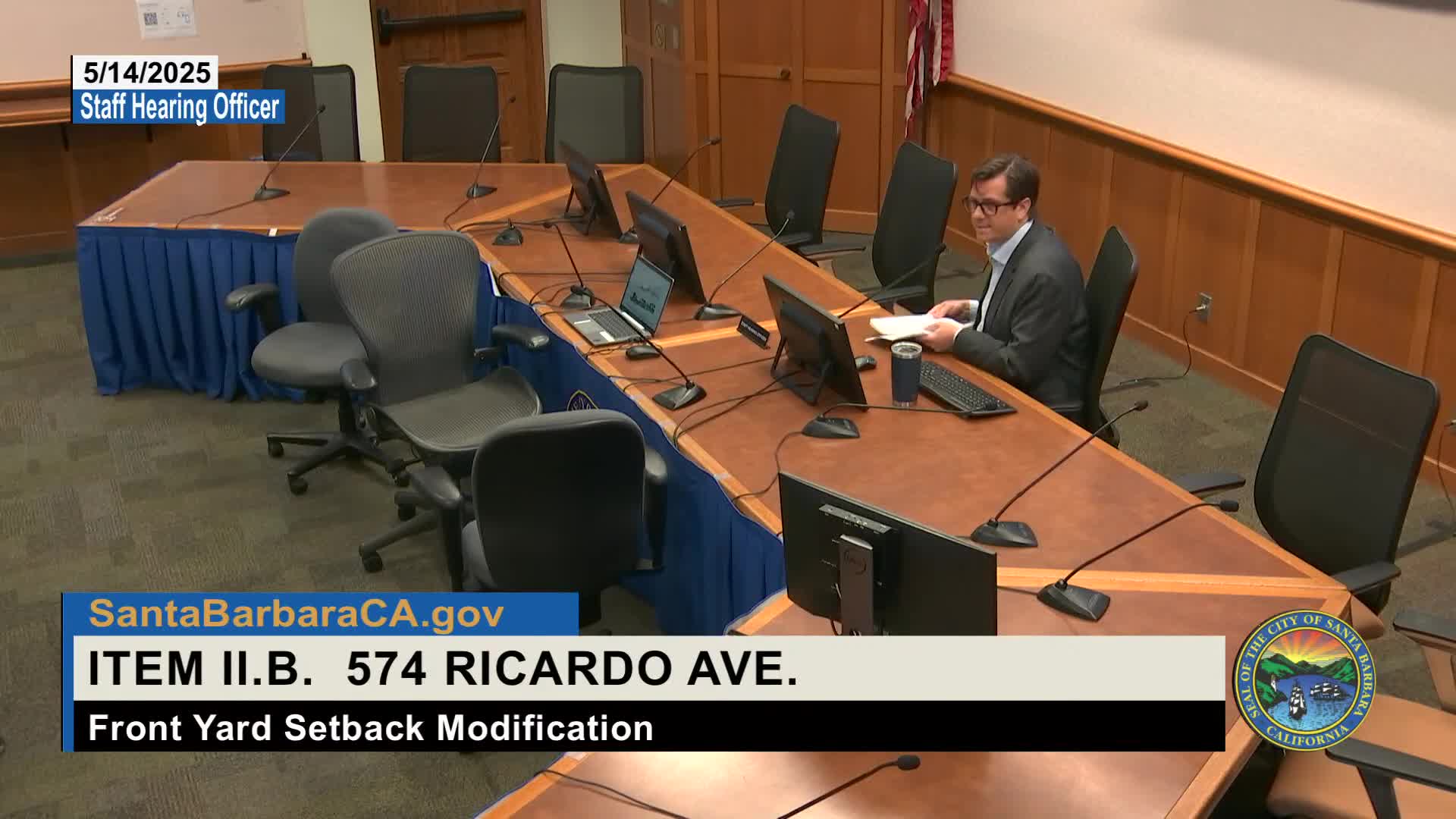 Staff Hearing Officer approves front-setback modification for 574 Ricardo Avenue after structural issues require full rebuild