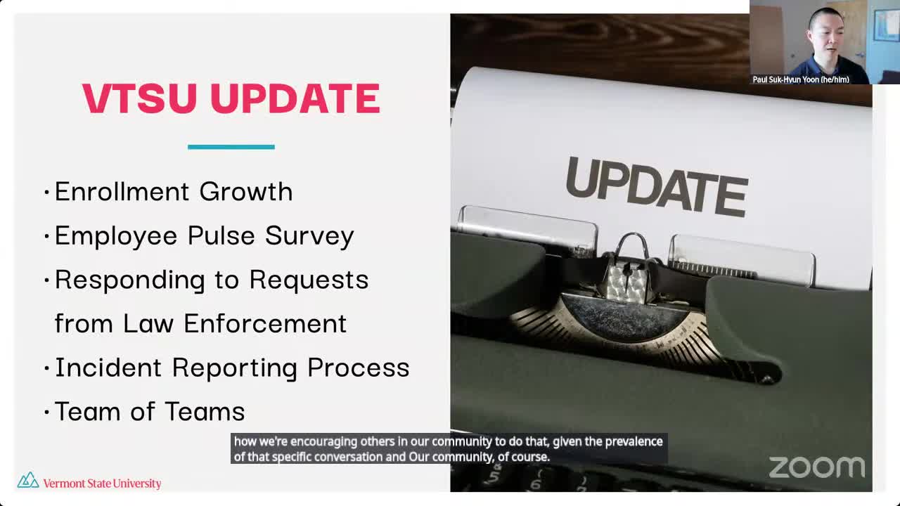 Vermont State University reports enrollment growth, employee pulse survey and hires; expands incident-reporting work