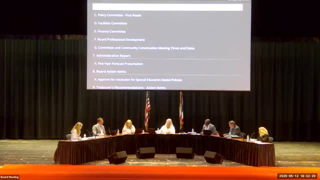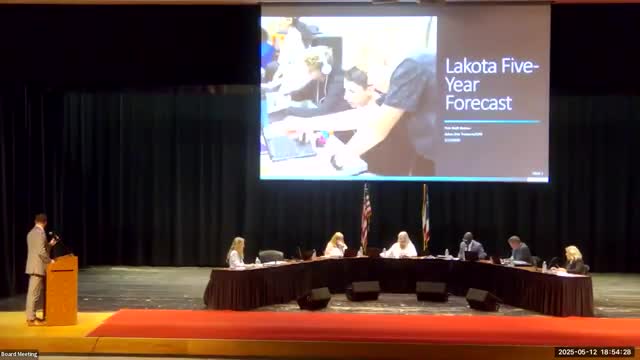 Treasurer presents May update to five‑year forecast; district models reserve accounts and a 2029 levy