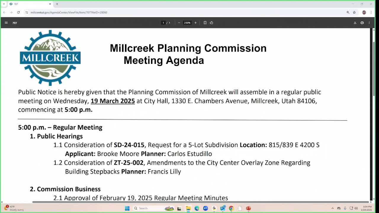 Millcreek planning commission approves five‑lot subdivision SD 24015 with underground utility condition