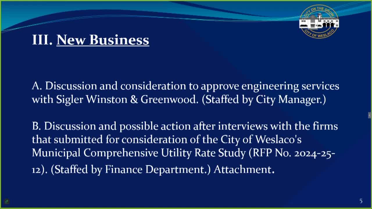 Weslaco approves month-to-month engineering services with Sigler, Winston & Greenwood at $7,999 per month