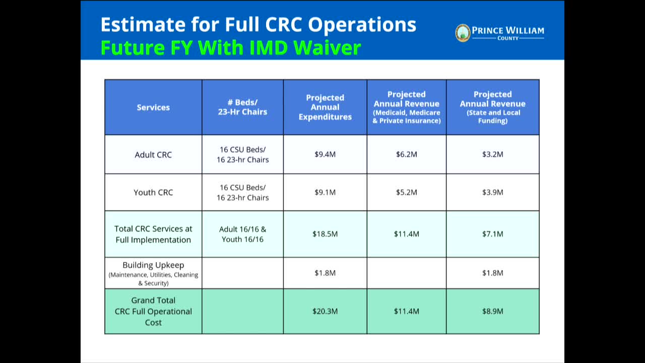 County briefs Board on Crisis Receiving Center: beds, licensing, Medicaid waiver and construction timeline