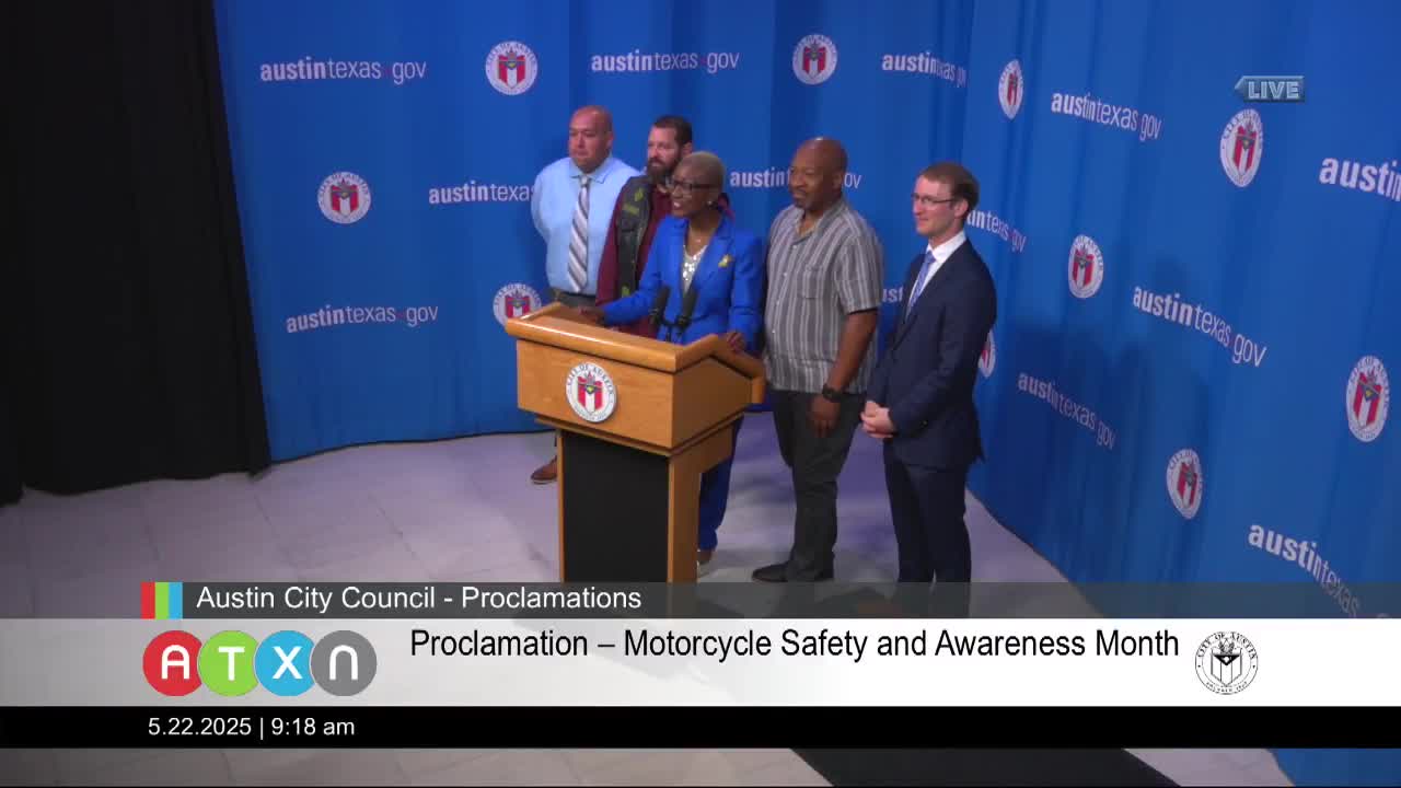 Austin proclaims Motorcycle Safety Awareness Month; council member urges drivers to "look" for riders