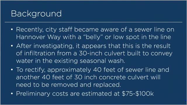 City identifies Hanover Way sewer line settlement; staff recommends urgent repair estimated $75K–$100K
