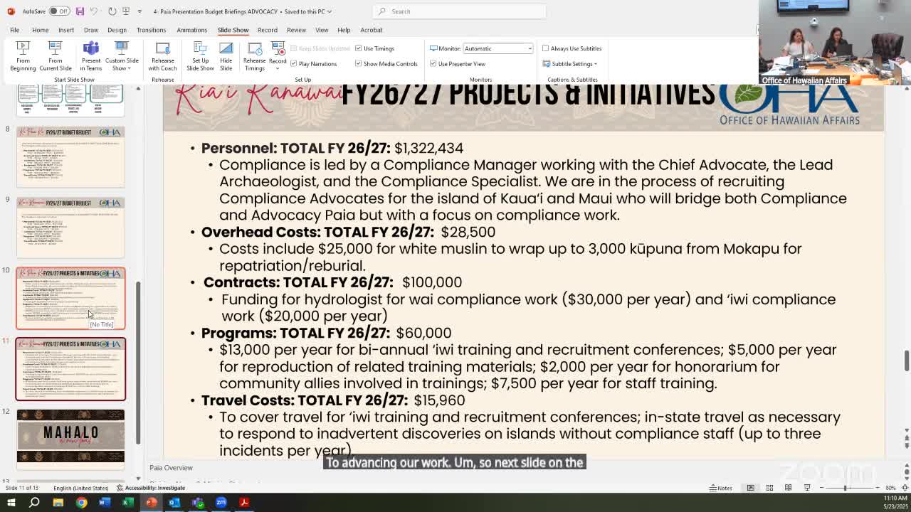 Advocacy and compliance present hires, burial‑site work and ocean policy priorities for OHA budget
