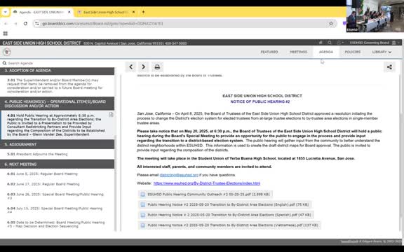 East Side Union High holds public hearing on switch to trustee-area elections; consultants outline maps, schedule and public tools