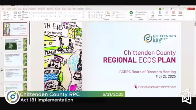 CCRPC summarizes Act 181/ECOS outreach, housing targets and future land‑use map; schedule set for municipal review and LURB submission