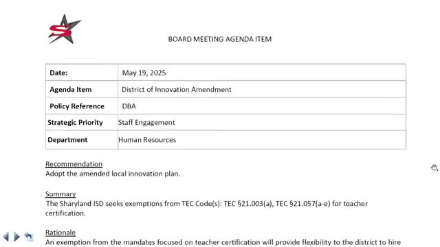 Sharyland ISD board approves District of Innovation amendment to broaden district-issued certification for CTE and programming
