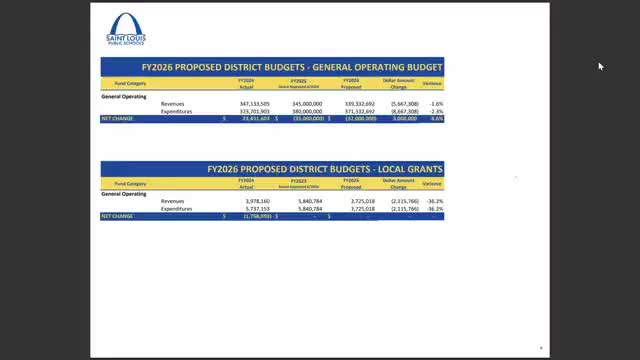 SLPS CFO presents FY26 proposed budget showing projected use of fund balance; board discussion on grants and staffing costs