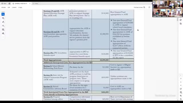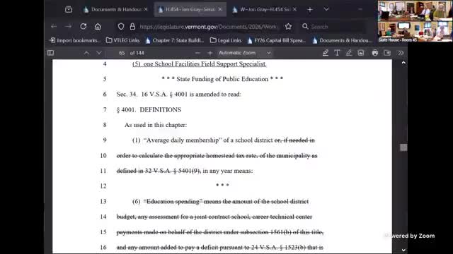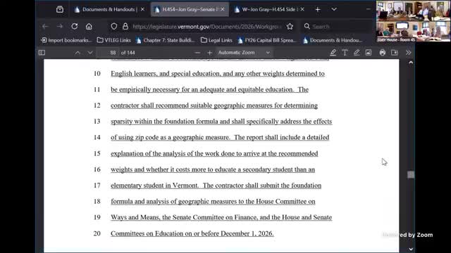 H.454 includes JFO cost‑factor contract and a school‑redistricting task force; members question scope and budget