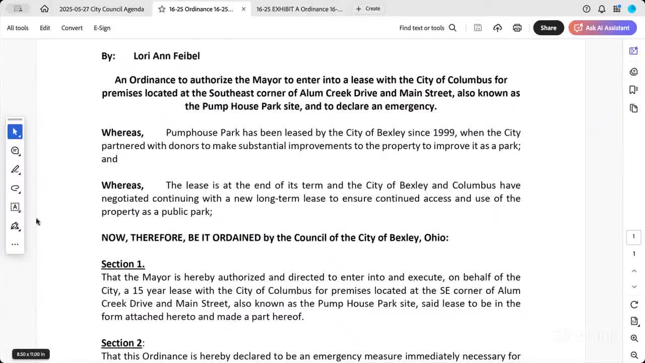 Council reviews $1 annual lease with Columbus for Pumphouse Park; city retains programming control