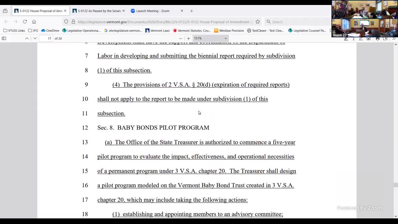 Committee debates baby‑bonds pilot language in S.122; members request treasurer testimony