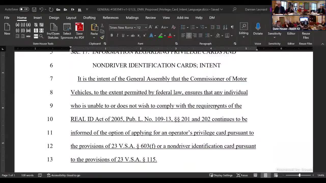 Committee revisits DMV identification language after USDOT memo; staff warns of germane‑ness challenges