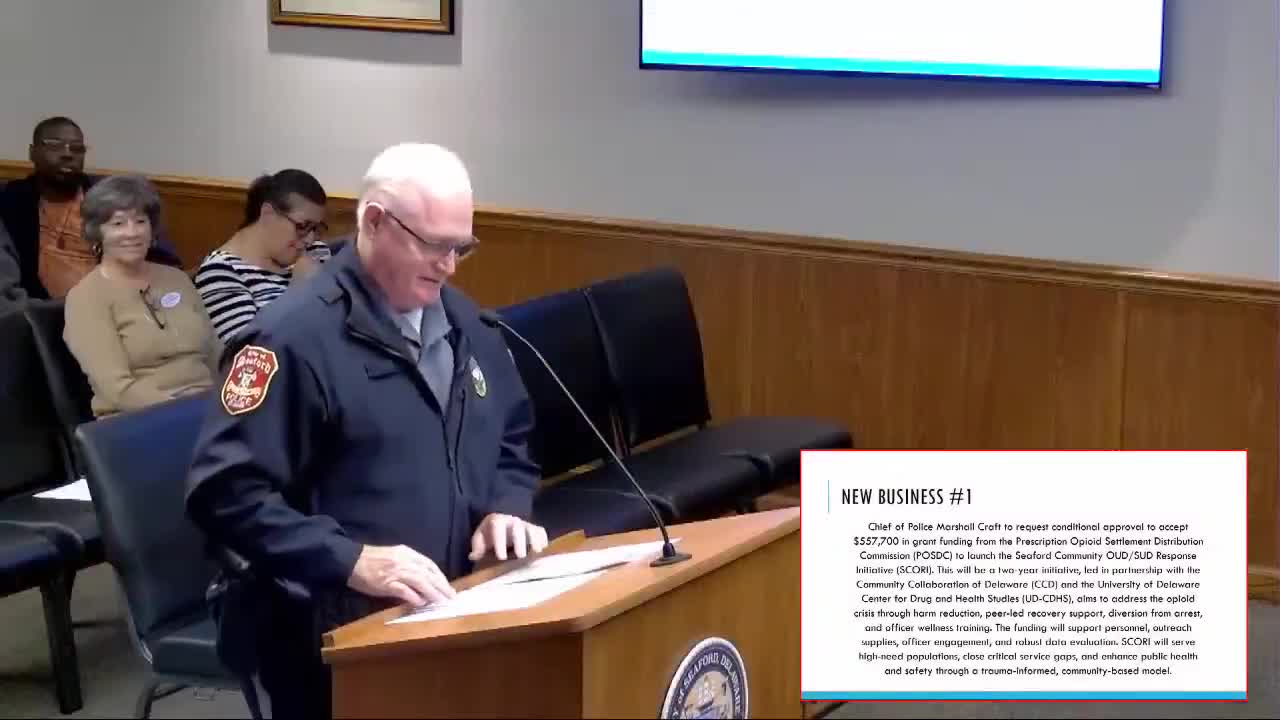 Seaford to pursue opioid‑settlement funding for peer support and data evaluation; council approves acceptance upon award