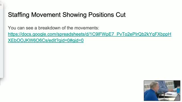 District shows live personnel spreadsheet and cut list; staff savings detailed but benefits not yet included