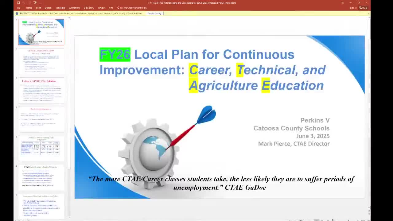 CTAE director outlines Perkins V and state grant applications, forecasts $134,000 federal Perkins award and multiple state grants