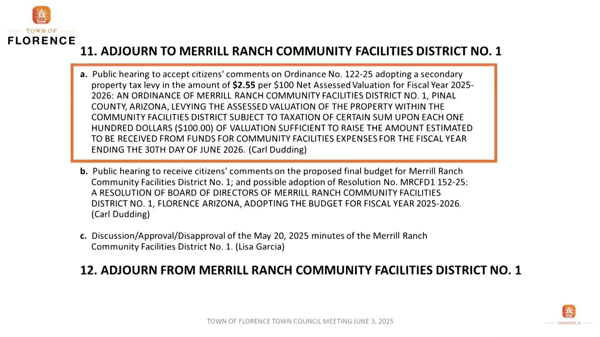 Merrill Ranch CFDs adopt levies and budgets covering debt service and operations