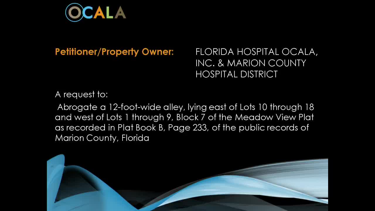 Planning commission approves alley aggregation between hospital parcels; utility easement and Ocala Electric agreement required