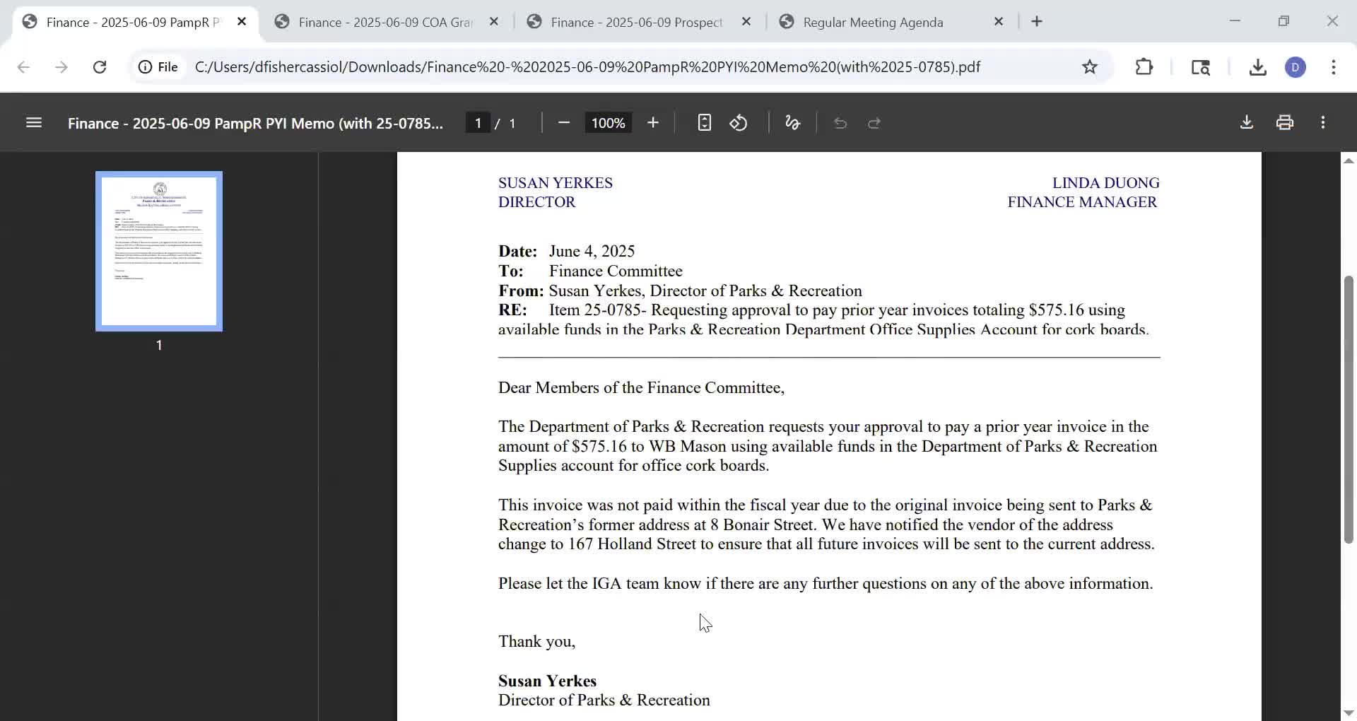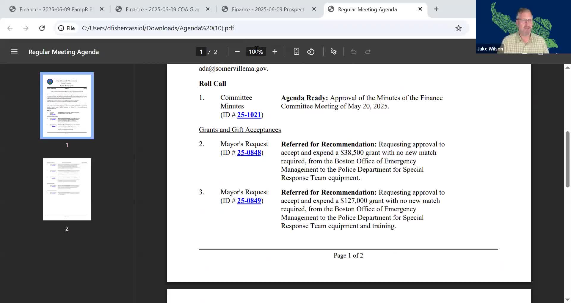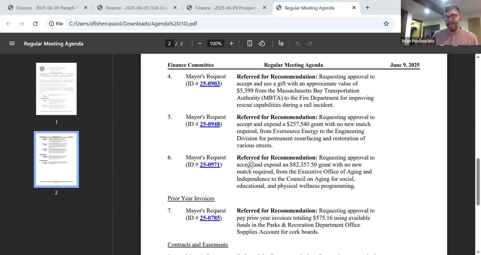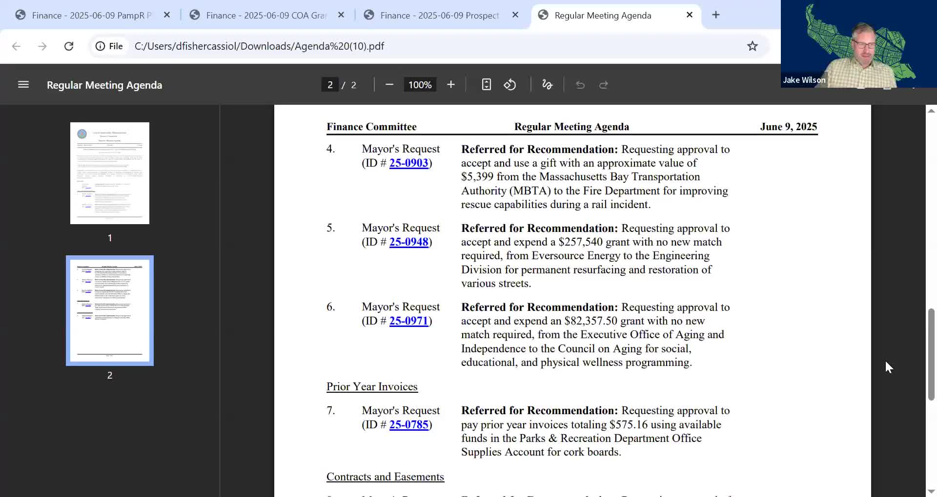Finance committee recommends approval of minutes, Council on Aging grant and small Parks invoice; police grants held in committee