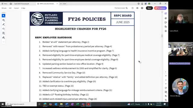 Commission reviews multi-point employee handbook revisions including parental leave and holidays