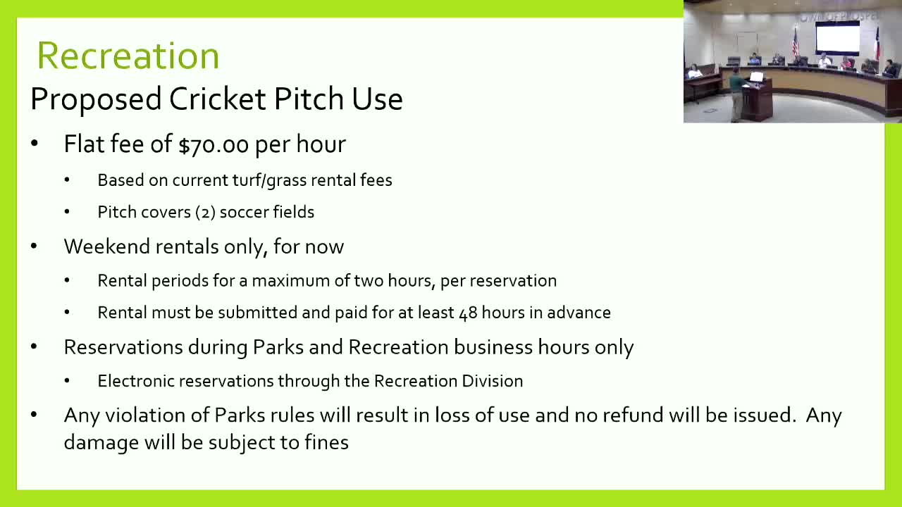 Board hears updates on cricket pitch reservations, 407 Rec Center improvements and park signage