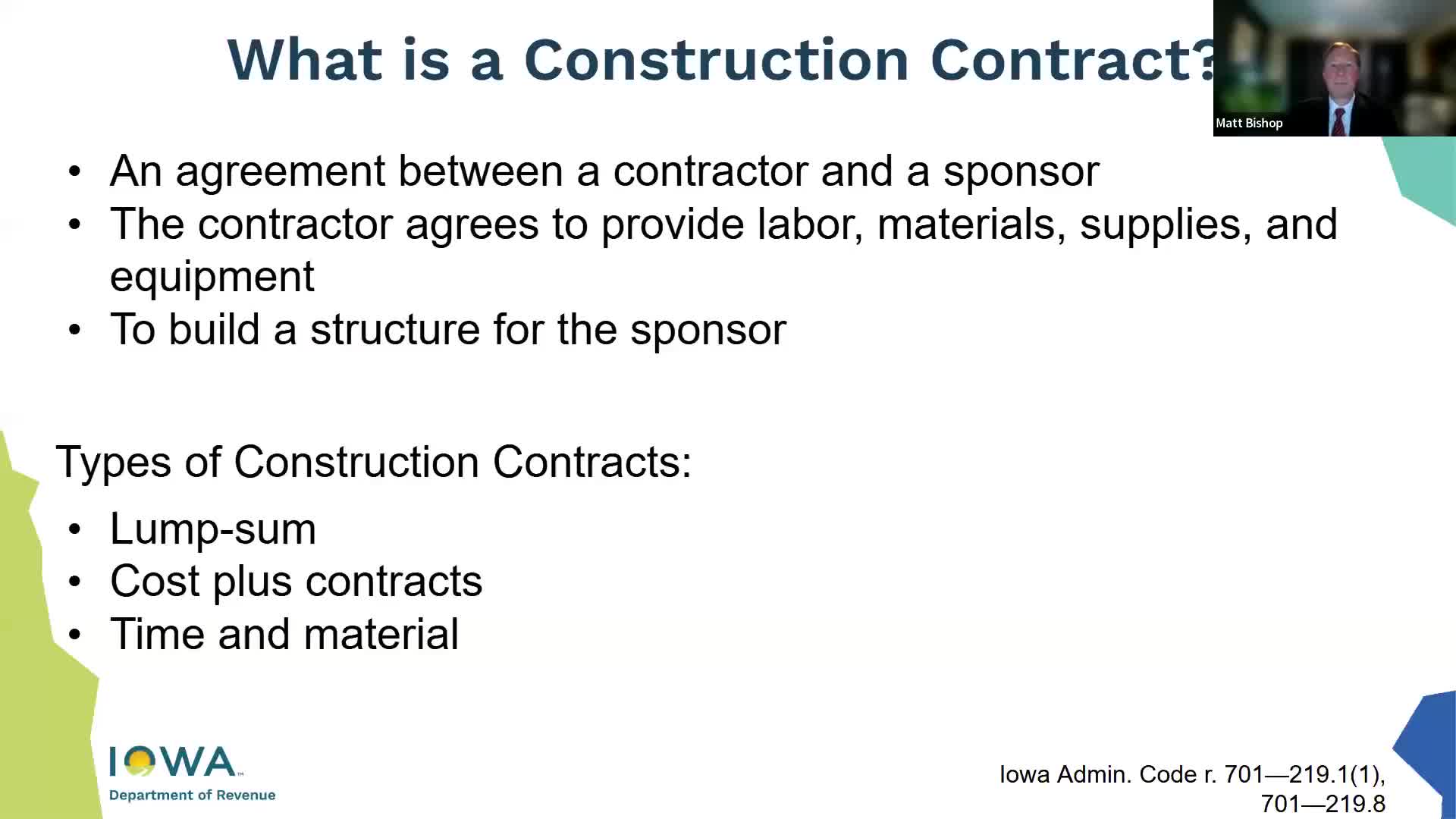 Iowa Department of Revenue explains how construction contracts, contractor classifications and materials are taxed