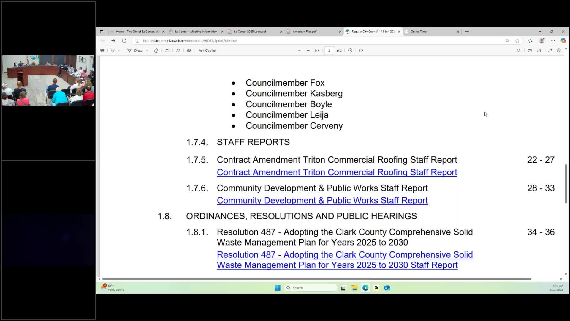 La Center council adopts Clark County solid‑waste plan, authorizes roofing change orders under budget