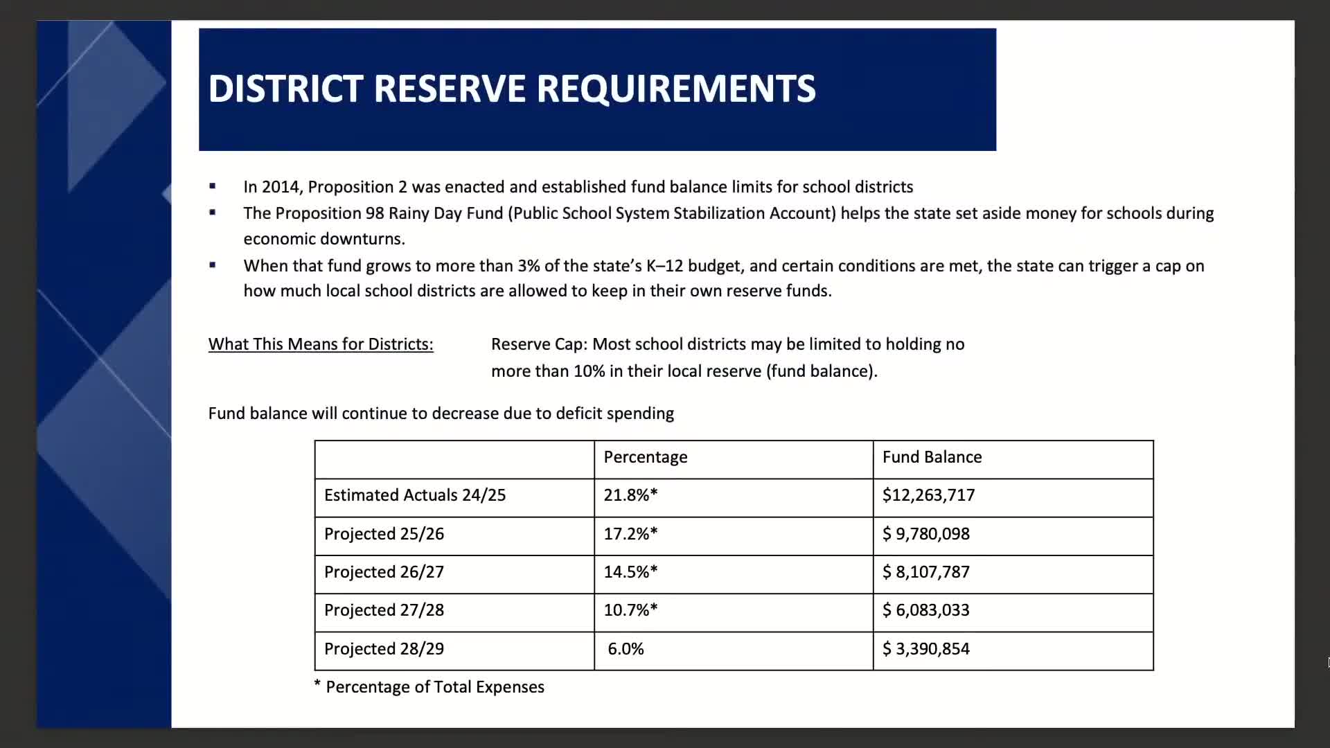 Duarte Unified budget presentation shows multi‑year structural deficit narrowing; warns fund balance will shrink without state certainty