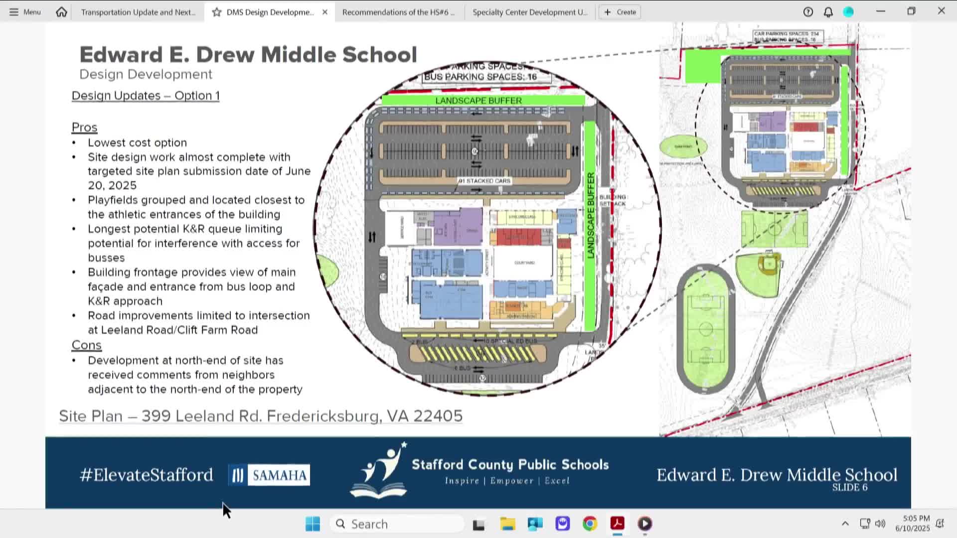Design team recommends 'Option 1' for Drew Middle School site; board and neighbors press safety, parking and buffering details